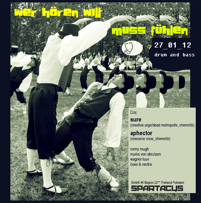 Unter dem Motto „Drum & Bass und Weltfrieden“ startet die Partyreihe „Wer hören will, muss fühlen“ im Spartacus zu Potsdam in das neue Jahr. Neben einigen Potsdamern werden sich an dem Abend auch Sure von Dead Metropolis und Aphector von der Resource Crew die Ehre geben. mehr ...