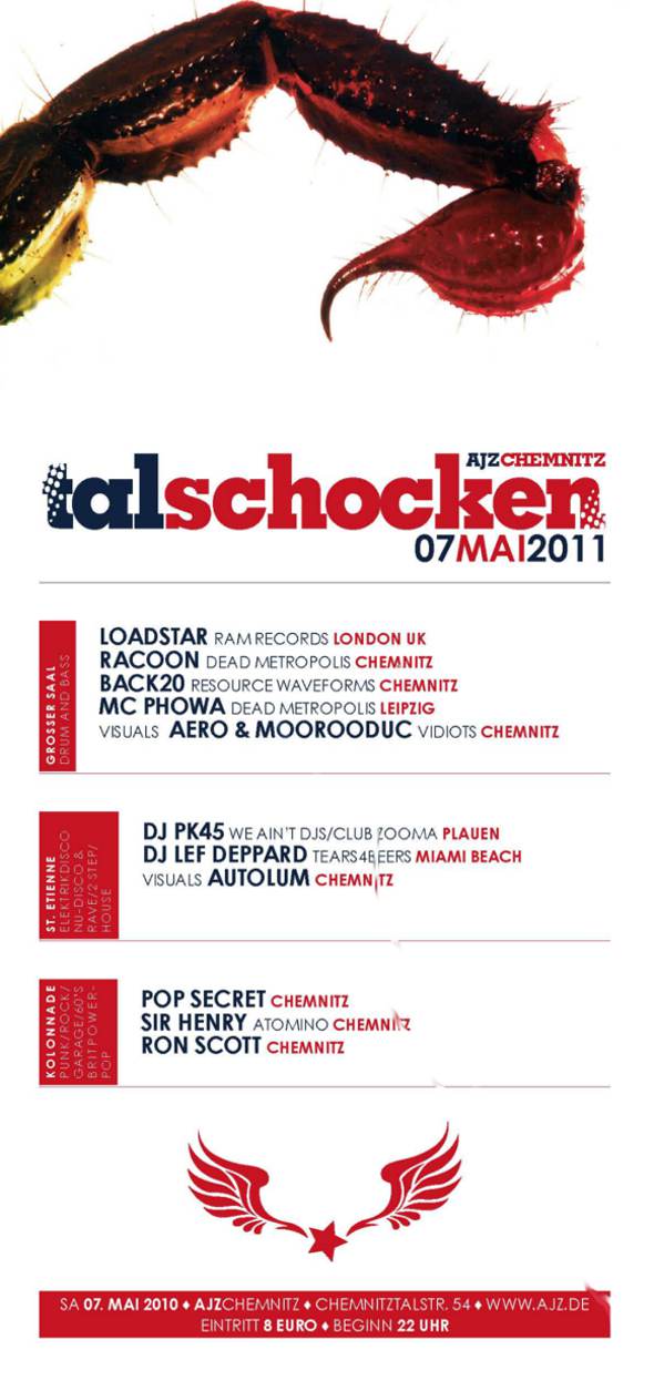 Mit einem super Act von der Insel wird am 07.05. 2011 das Lineup zum Talschocken wieder besonders sein. Mit "Loadstar" (Ram Records, http://www.myspace.com/loadstaruk / London UK) konnten wir Xample und Lomax buchen, die mit ihrem Projekt an drei Playern gerade richtig durchstarten. Unterstützt werden sie an diesem Abend auf dem Drum & Bass Floor von Racoon (Dead Metropolis/Chemnitz), Back20 (Resource/Waveforms/Chemnitz) und MC Phowa (Dead Metropolis/Leipzig). Visuell wird der Abend von den VJs Aero & Moorooduc/Vidiots gestaltet. mehr ...